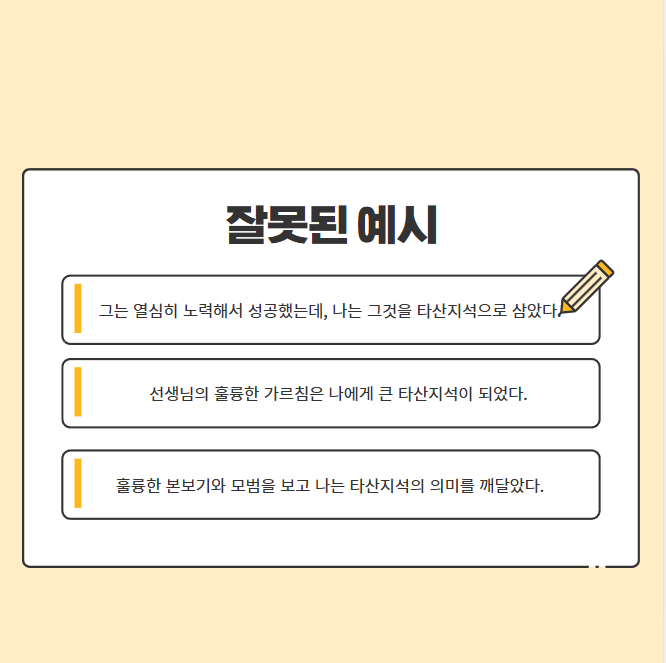 중요한 점은 이 사자성어가 항상 ‘타인의 잘못이나 실패 → 나의 성찰과 발전’이라는 구조로 쓰여야 한다는 것입니다. 단순히 좋은 본보기나 훌륭한 모범을 보면서 배우는 것은 타산지석이 아니라 다른 사람의 부족한 점을 반면교사 삼는다는 맥락이 담겨 있어야 합니다.