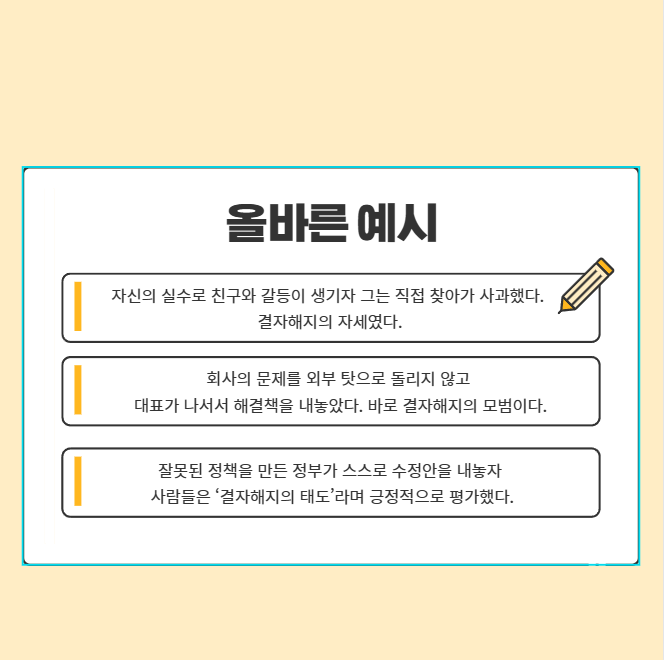 자신이 만든 문제는 자신이 책임지고 수습하라는 말과도 일맥상통합니다. 또한 결자해지(結者解之)는 인간관계나 사회적 문제를 다룰 때 매우 중요한 교훈이 됩니다. 누군가의 말 한마디나 행동이 갈등의 원인이 되었다면 그 사람이 진심으로 사과하고 관계를 회복하는 것이 올바른 태도라는 뜻이기도 합니다.
