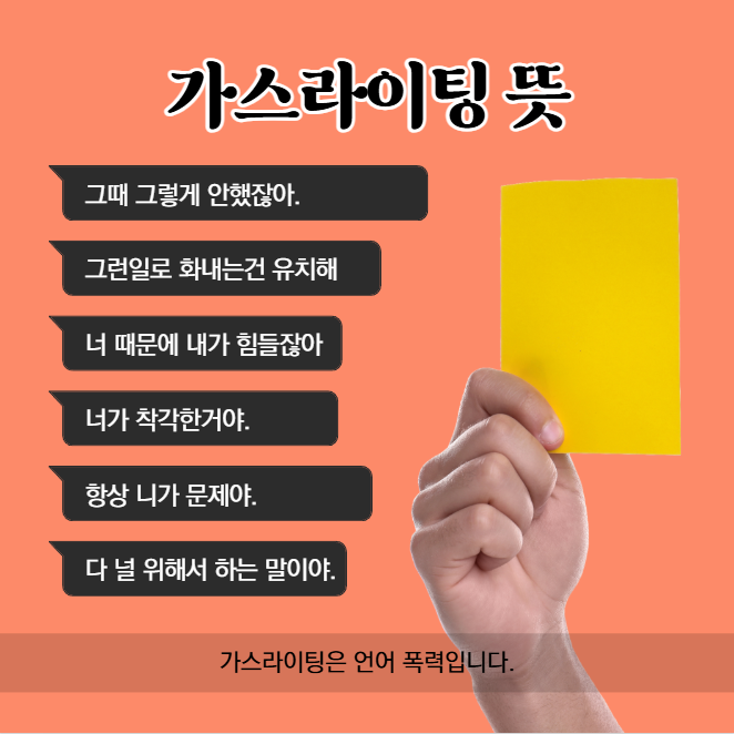 가스라이팅 뜻, 예시 화법, 대응 정리해봅시다. 1. 가스라이팅의 정확한 뜻과 특징가스라이팅(Gaslighting)이라는 단어는 심리학과 인간관계에서 점점 더 자주 사용되는 개념입니다.이는 단순한 감정 조종을 넘어 상대의 인식과 판단력을 교묘하게 흔들어 자신의 통제 아래 두는 심리적 지배 행위를 뜻합니다.이 용어는 1938년 영국에서 발표된 연극 《가스 라이트(Gas Light)》에서 유래했습니다. 극 중 남편은 집안의 가스등을 일부러 어둡게 만들고 아내가 이상하다고 말하자 “네가 착각한 거야”라며 반복적으로 부정합니다. 이로 인해 아내는 자신이 정신적으로 문제가 있다고 믿게 됩니다. 바로 이 장면에서 가스라이팅이라는 말이 탄생했습니다.가스라이팅의 핵심은 상대방의 현실 감각과 자존감을 무너뜨려 가해자에게..